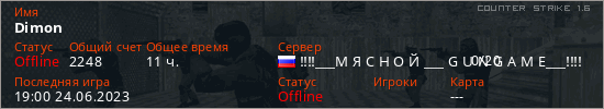 Играет на Counter Strike 1.6 сервере. Страна: РоссияПервый раз замечен 21:36 21.10.2022