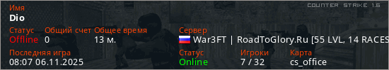Последний раз был в сети 08:07 06.11.2025 Игрок с таким ником замечен на 21 сервере