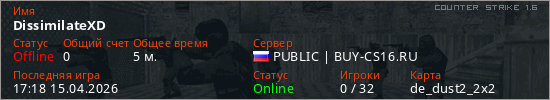 Играет на Counter Strike 1.6 сервере. Страна: РоссияПервый раз замечен 17:10 15.04.2026