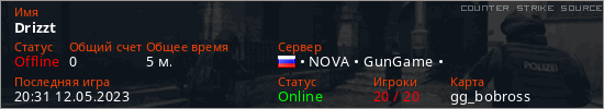 Играет на Counter Strike Source сервере. Страна: РоссияПервый раз замечен 20:29 12.05.2023