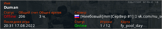Последний раз был в сети 20:31 17.08.2022 Игрок с таким ником замечен на 5 серверах