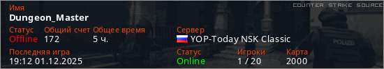 Играет на Counter Strike Source сервере. Страна: РоссияПервый раз замечен 16:52 19.04.2025