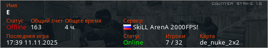 Играет на Counter Strike 1.6 сервере. Страна: РоссияПервый раз замечен 10:14 31.07.2022