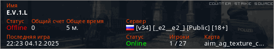 Играет на Counter Strike Source сервере. Страна: РоссияПервый раз замечен 22:15 04.12.2025
