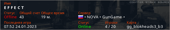 Играет на Counter Strike Source сервере. Страна: РоссияПервый раз замечен 07:35 24.01.2023