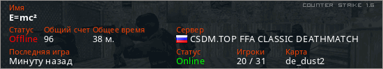 Играет на Counter Strike 1.6 сервере. Страна: РоссияПервый раз замечен 02:42 14.02.2026