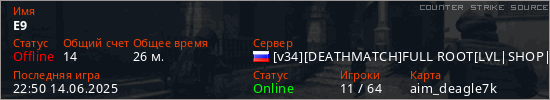 Играет на Counter Strike Source сервере. Страна: РоссияПервый раз замечен 22:08 06.06.2025