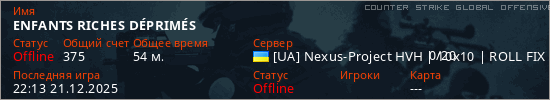 Играет на Counter Strike Global Offensive сервере. Страна: УкраинаПервый раз замечен 17:15 16.12.2025