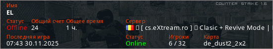 Играет на Counter Strike 1.6 сервере. Страна: РумынияПервый раз замечен 16:34 10.12.2024
