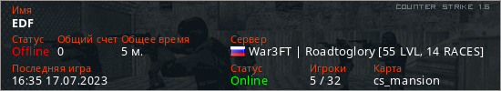 Играет на Counter Strike 1.6 сервере. Страна: РоссияПервый раз замечен 16:27 17.07.2023