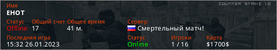 Играет на Counter Strike 1.6 сервере. Страна: РоссияПервый раз замечен 14:53 26.01.2023