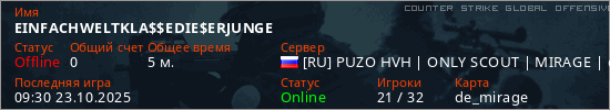 Играет на Counter Strike Global Offensive сервере. Страна: РоссияПервый раз замечен 08:54 23.10.2025