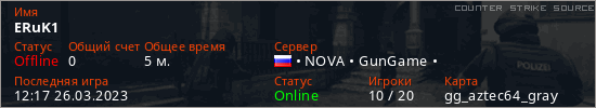 Играет на Counter Strike Source сервере. Страна: РоссияПервый раз замечен 12:13 26.03.2023