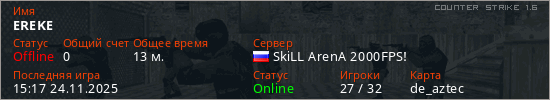 Играет на Counter Strike 1.6 сервере. Страна: РоссияПервый раз замечен 12:55 16.04.2023