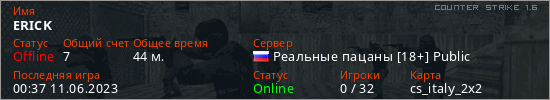 Играет на Counter Strike 1.6 сервере. Страна: РоссияПервый раз замечен 00:15 11.06.2023