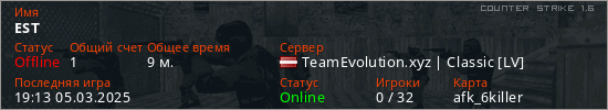 Играет на Counter Strike 1.6 сервере. Страна: ЛатвияПервый раз замечен 20:24 04.03.2025