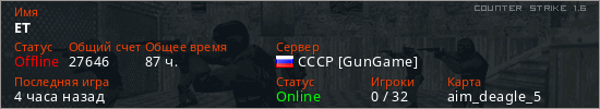 Играет на Counter Strike 1.6 сервере. Страна: РоссияПервый раз замечен 11:19 21.04.2025