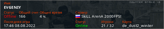 Играет на Counter Strike 1.6 сервере. Страна: РоссияПервый раз замечен 14:18 24.07.2022