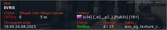 Играет на Counter Strike Source сервере. Страна: РоссияПервый раз замечен 19:00 26.08.2025