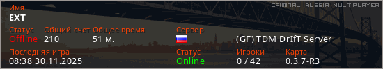 Играет на Criminal Russia Multiplayer сервере. Страна: РоссияПервый раз замечен 18:58 29.11.2025