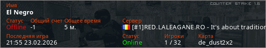Играет на Counter Strike 1.6 сервере. Страна: РумынияПервый раз замечен 21:53 23.02.2026