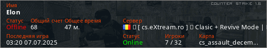 Играет на Counter Strike 1.6 сервере. Страна: РумынияПервый раз замечен 23:56 04.01.2025