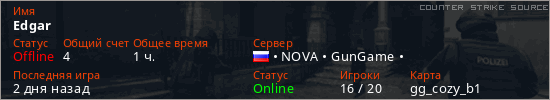 Играет на Counter Strike Source сервере. Страна: РоссияПервый раз замечен 21:27 25.03.2024