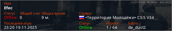 Играет на Counter Strike Source сервере. Страна: РоссияПервый раз замечен 20:14 10.11.2025