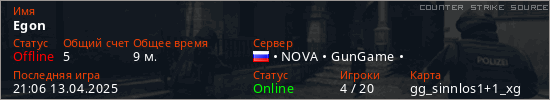 Играет на Counter Strike Source сервере. Страна: РоссияПервый раз замечен 20:46 09.04.2025