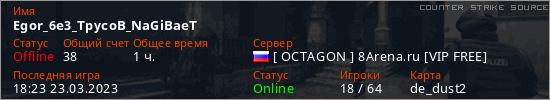 Последний раз был в сети 18:23 23.03.2023 Игрок с таким ником замечен на 2 серверах