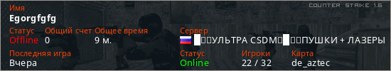 Играет на Counter Strike 1.6 сервере. Страна: РоссияПервый раз замечен 22:36 17.03.2026