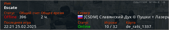 Играет на Counter Strike 1.6 сервере. Страна: РоссияПервый раз замечен 16:48 06.09.2024