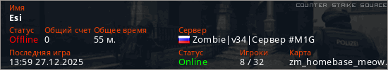 Играет на Counter Strike Source сервере. Страна: РоссияПервый раз замечен 19:17 24.08.2025