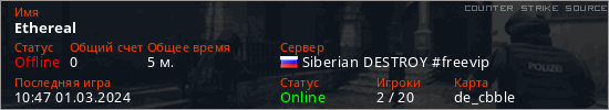 Играет на Counter Strike Source сервере. Страна: РоссияПервый раз замечен 10:45 01.03.2024