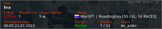 Играет на Counter Strike 1.6 сервере. Страна: РоссияПервый раз замечен 00:03 22.01.2023