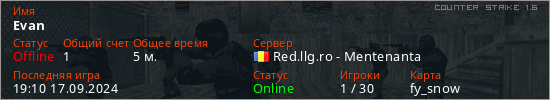 Играет на Counter Strike 1.6 сервере. Страна: РумынияПервый раз замечен 19:04 17.09.2024