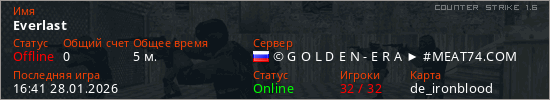Играет на Counter Strike 1.6 сервере. Страна: РоссияПервый раз замечен 16:37 28.01.2026