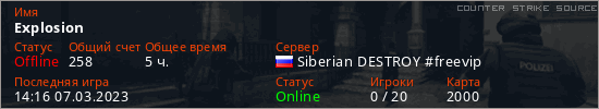 Играет на Counter Strike Source сервере. Страна: РоссияПервый раз замечен 17:29 19.02.2023