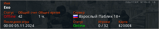 Последний раз был в сети 00:00 05.11.2024 Игрок с таким ником замечен на 11 серверах