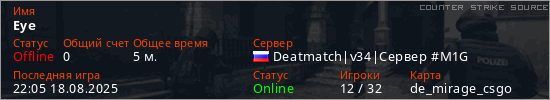 Играет на Counter Strike Source сервере. Страна: РоссияПервый раз замечен 21:59 18.08.2025