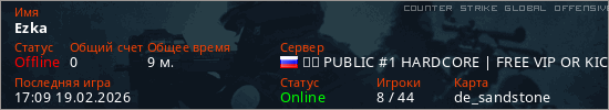 Играет на Counter Strike Global Offensive сервере. Страна: РоссияПервый раз замечен 23:51 18.02.2026