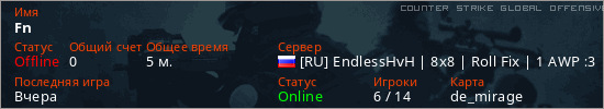 Играет на Counter Strike Global Offensive сервере. Страна: РоссияПервый раз замечен 20:58 29.01.2026