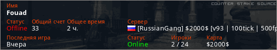 Играет на Counter Strike Source сервере. Страна: РоссияПервый раз замечен 22:53 06.11.2025