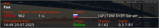 Играет на Criminal Russia Multiplayer сервере. Страна: РоссияПервый раз замечен 20:12 18.07.2025