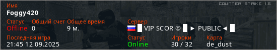 Играет на Counter Strike 1.6 сервере. Страна: РоссияПервый раз замечен 13:22 10.09.2025