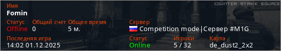 Играет на Counter Strike Source сервере. Страна: РоссияПервый раз замечен 13:55 01.12.2025