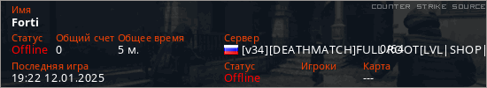 Играет на Counter Strike Source сервере. Страна: РоссияПервый раз замечен 19:08 12.01.2025