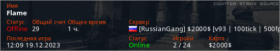 Играет на Counter Strike Source сервере. Страна: РоссияПервый раз замечен 14:19 28.06.2023