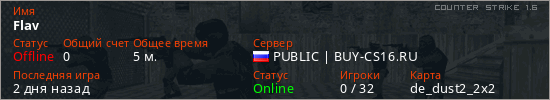 Играет на Counter Strike 1.6 сервере. Страна: РоссияПервый раз замечен 17:49 15.03.2026