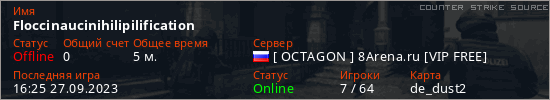 Играет на Counter Strike Source сервере. Страна: РоссияПервый раз замечен 16:08 27.09.2023